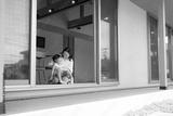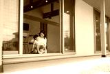 軒先や縁側で抱っこでくつろぐ母親と娘(子供)子育ての幸せのイメージ広角の全身