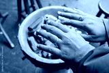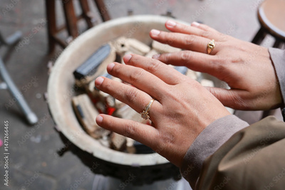 Hands warming over charcoal fire in a cozy indoor setting
