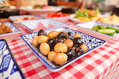 Colorful assortment of olives served at a vibrant market stall