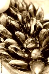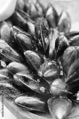 Colorful mussels displayed on a wooden surface, ready for cooking