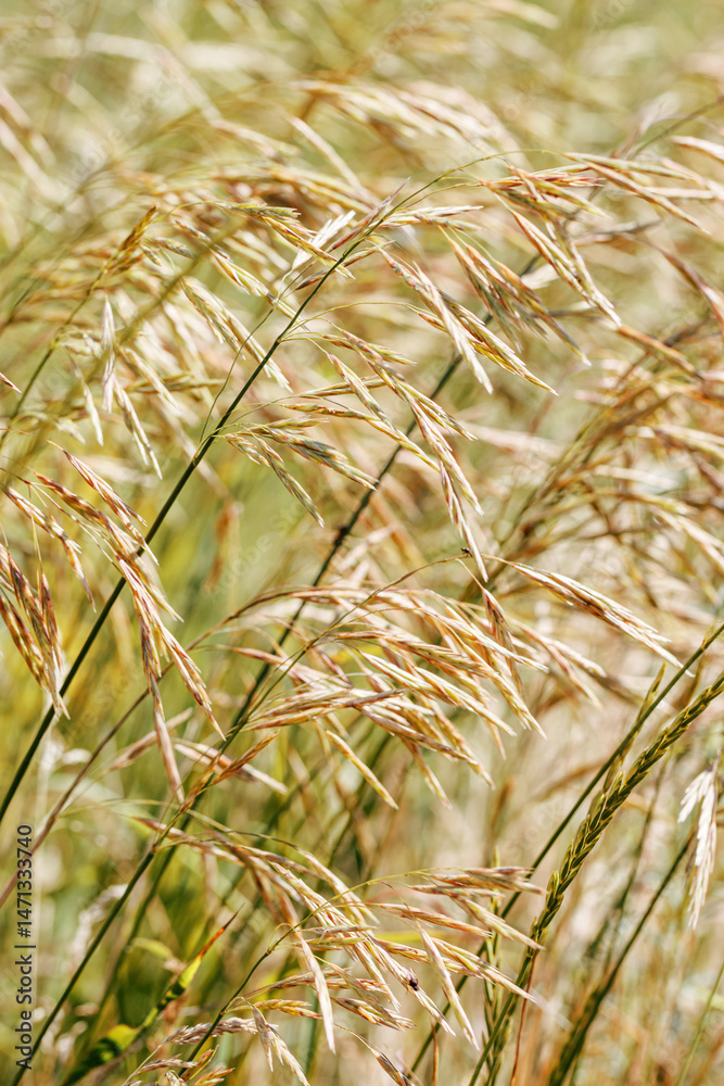 Close up view of green beige wild grasses growing in meadow at sunlight. Natural, warm, serene atmosphere. Natural beauty landscape, Minimal natural texture pattern of summer grass, blur background