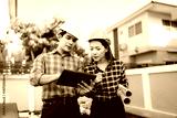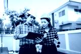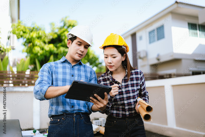 Two engineers wearing hard hats discuss blueprints and plans at an outdoor construction site, using laptops to review architecture.