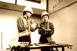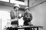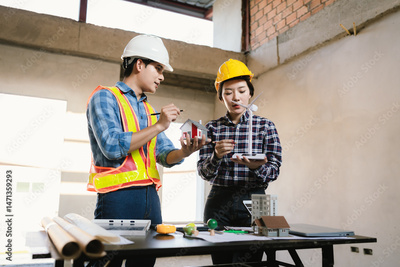 Architects and engineers collaborate at a desk with blueprints and solar panels, planning sustainable energy solutions for eco-friendly construction projects.