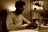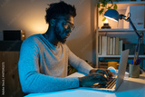 Happy black man working at home office using laptop. African American male college student studying late at night at home.