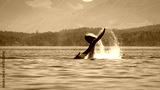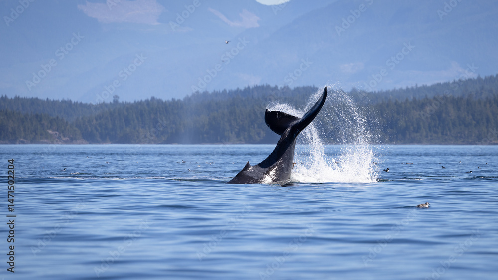 Seascape with Whale tail. The humpback whale (Megaptera novaeangliae) tail dripping with water in Knight Inlet, Vancouver Island, BC, Canada.