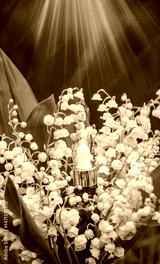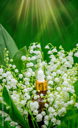 Glass bottle of lily of the valley essential oil with fresh flowers.
