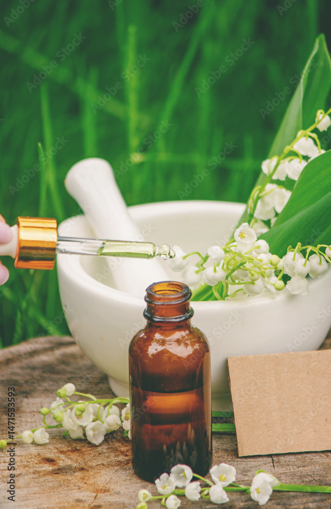 Glass bottle of lily of the valley essential oil with fresh flowers.