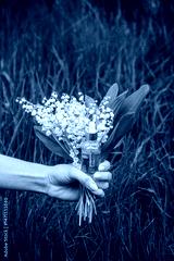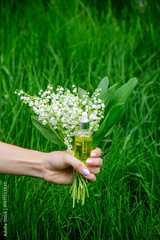 Glass bottle of lily of the valley essential oil with fresh flowers.