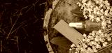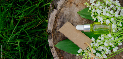 Glass bottle of lily of the valley essential oil with fresh flowers.