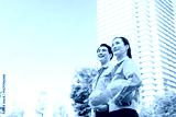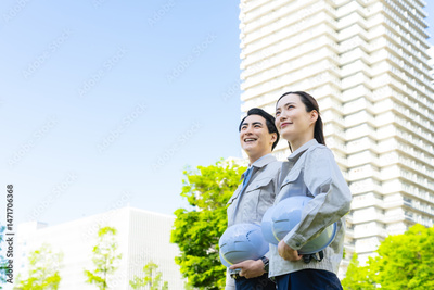 新緑の街に立つ男女エンジニアのグループ