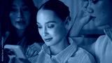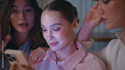 Closeup three women browsing mobile phone social media on evening home couch.