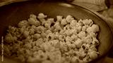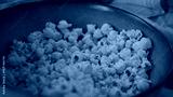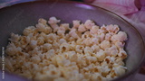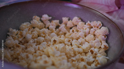 Closeup hands taking popcorn from bowl at evening home. Unrecognizable friends