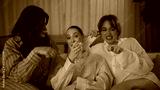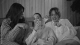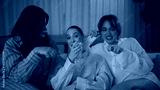 Laughing women watching television eating popcorn at pajamas party home closeup.