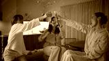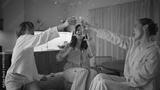 Celebrating women throwing confetti drinking champagne at home sleepover.