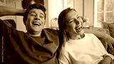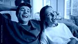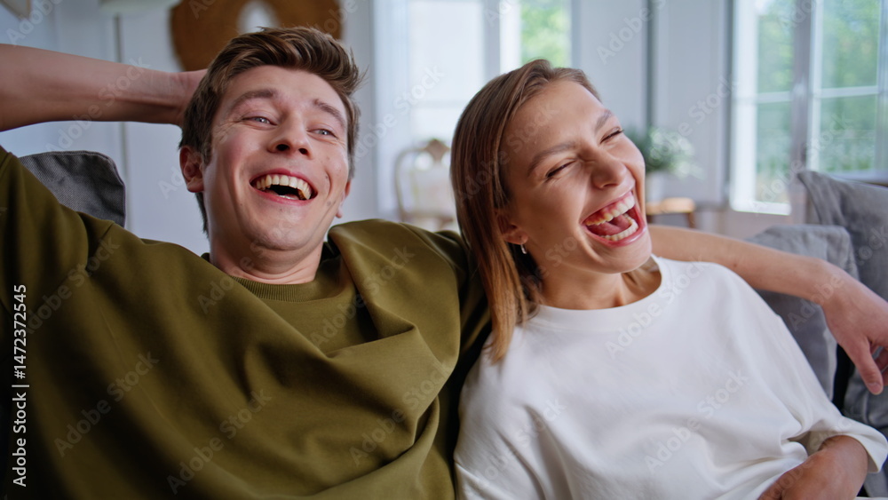 Laughing teenagers watching movie embracing home closeup. Couple enjoying comedy