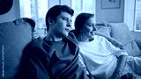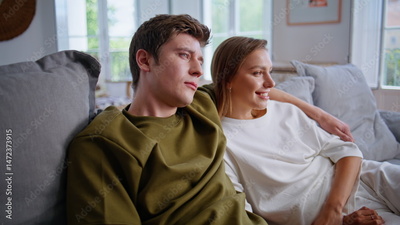Happy lovers watching tv together on weekend. Teenager couple embracing on sofa