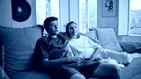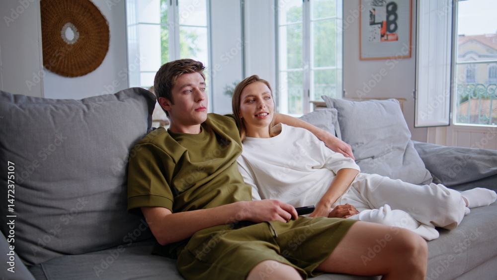 Romantic couple enjoy movie morning. Loving family resting together soft sofa