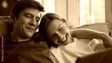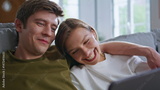 Laughing teenagers watching tablet movie in light house closeup. Happy couple