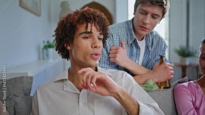 Closeup buddies talking home party. Young man holding beer communicating mate