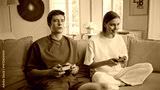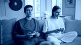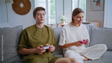 Smiling players enjoy video games sitting couch closeup. Couple playing online
