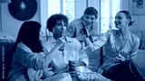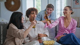 Happy friends clinking beer bottles at home gathering closeup. Joyful company
