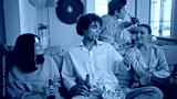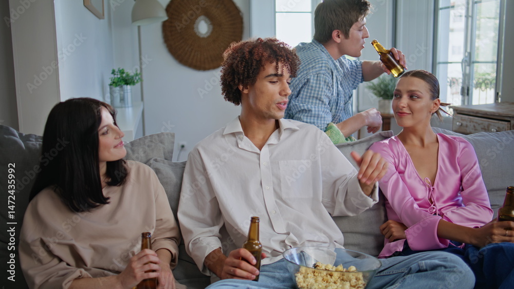 Curly guy talking friends sitting couch at living room. People watching sitcom