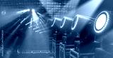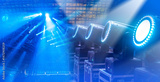 Bright stage lighting setup with multiple spotlights and beams illuminating an indoor concert venue, showcasing event lighting technology. – Event Production. Entertainment.