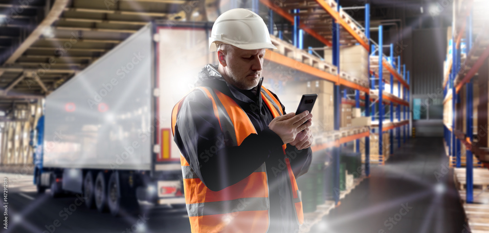 Man logistician. Employee of logistics company. Logistician with phone stands near truck. Warehouse racks with boxes behind transport dispatcher. Man warehouse manager. Logistician in reflective vest