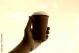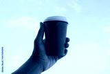Enjoying a warm drink against a clear blue sky backdrop
