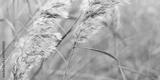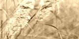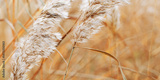 Natural autumn scenery from dry reeds grass, plants growing on lake against blur bokeh sunlight. Beautiful autumnal texture background, aesthetic nature pattern, vivid golden beige color