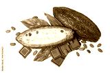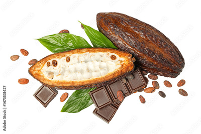 A split cacao pod reveals white pulp, cocoa beans, and dark chocolate on leaves nearby, isolated on white, PNG