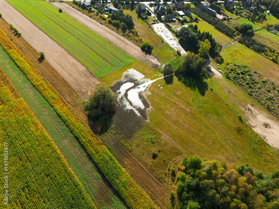 Aerial view of flooded farmland and trees