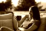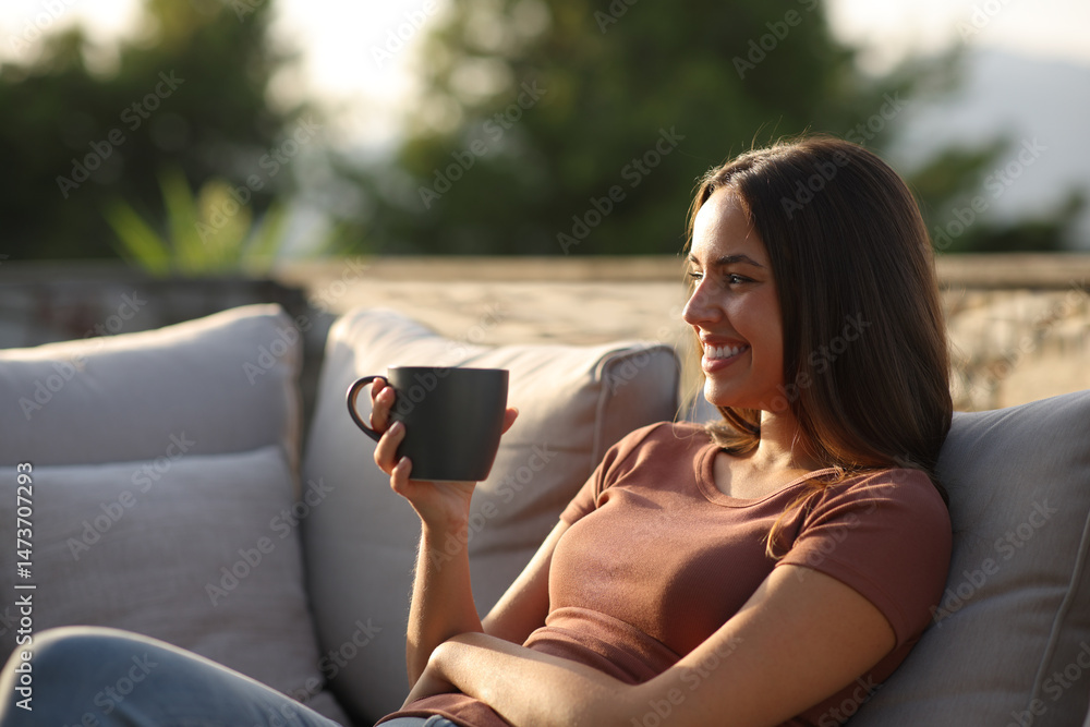Happy woman drinking coffee sitting on a sofa in a terrace