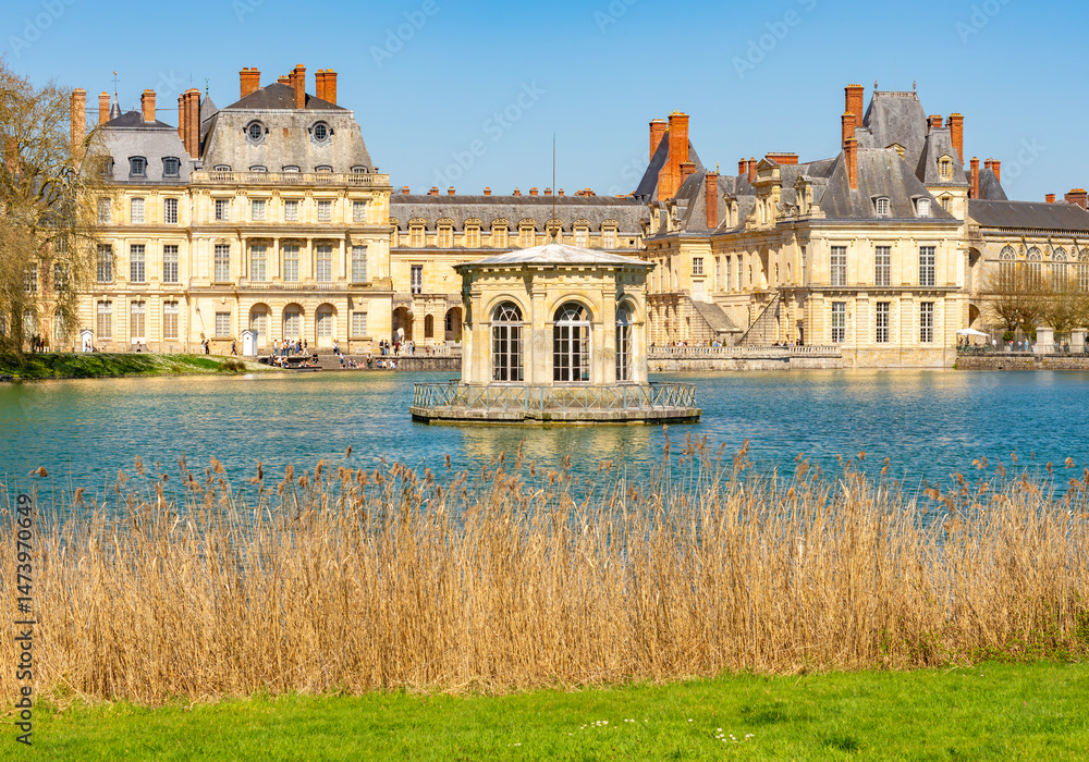 Fontainebleau palace (Chateau de Fontainebleau) and Carp's pond outside Paris, France