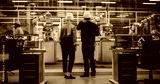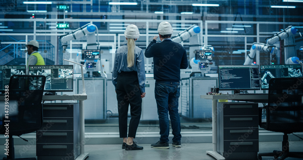 Female and Male Industrial Engineers Having a Conversation at a Modern Tech Electronics Factory with Automated Robot Arms Working with the Help of Artificial Intelligence Software. Back View
