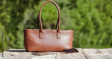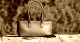 Feminine Accessories on Rustic Wooden Table in Sunny Garden – Purse, Flowers, and Smartphone in blurred natural garden background. Copy space for Mother's Day, Women's Day, fashion, lifestyle designs.