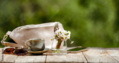 Feminine Accessories on Rustic Wooden Table in Sunny Garden – Purse, Flowers, and Smartphone in blurred natural garden background. Copy space for Mother's Day, Women's Day, fashion, lifestyle designs.