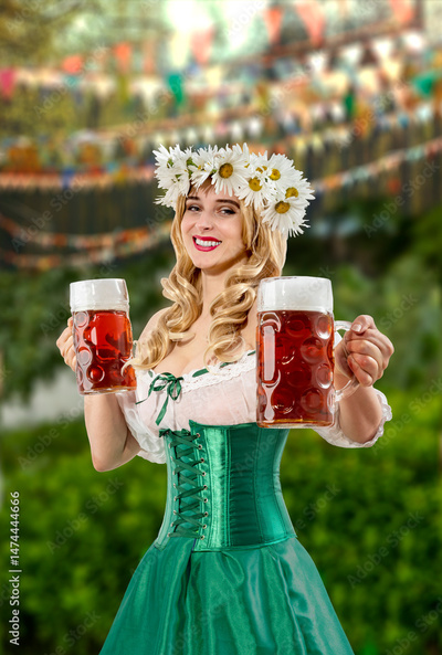 Midsummer woman waitress serving big beer mugs during beer party. Blonde girl with wreath daisies flowers in her hair celebrating traditional beer festival outdoor in summer or spring