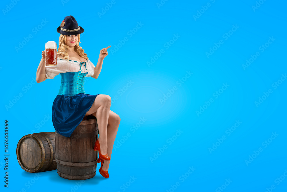 Oktoberfest girl sitting on a wooden barrel, waitress pointing arm at empty copy space. Woman in dirndl, tyrolean hat serving big beer mugs on isolated background. Traditional party, autumn festival.