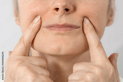 Smiling mouth mimic wrinkles close up. Female face without makeup, fingers massaging lips, wrinkle massage