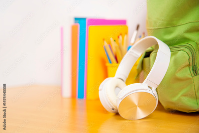 School books, headphones and backpack on a desk in a classroom during a break between lessons or after classes. Teenage style, audiobooks, music for learning concept.
