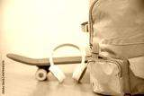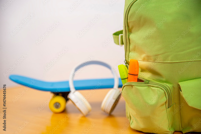 School backpack, skateboard and headphones. Teenage style, sport activity and learning concept. School holidays, free time after classes