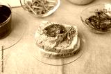 Chicken liver pate with wheat bread, arugula, sun-dried tomatoes and black tea. Homemade traditional rustic cuisine. Breakfast or snack option. Selective focus, close-up.
