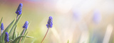 banner Blooming purple grape hyacinths, muscari fill a garden, basking in the warm spring sunlight and creating a vibrant, cheerful atmosphere that celebrates the beauty of nature, copy space
