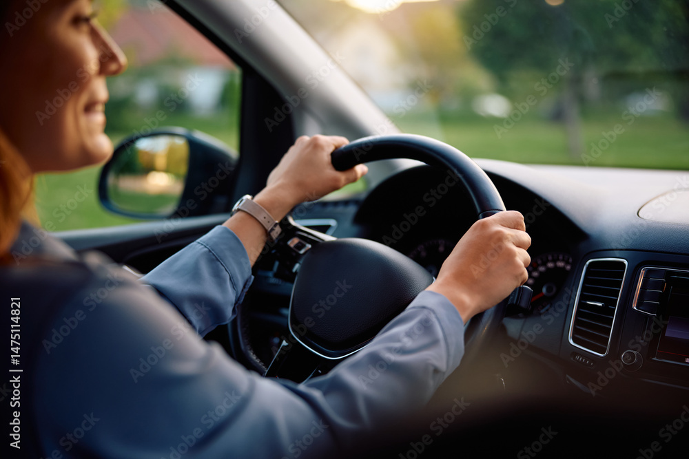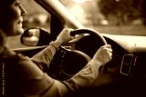 Close up of woman behind steering wheel of car.