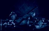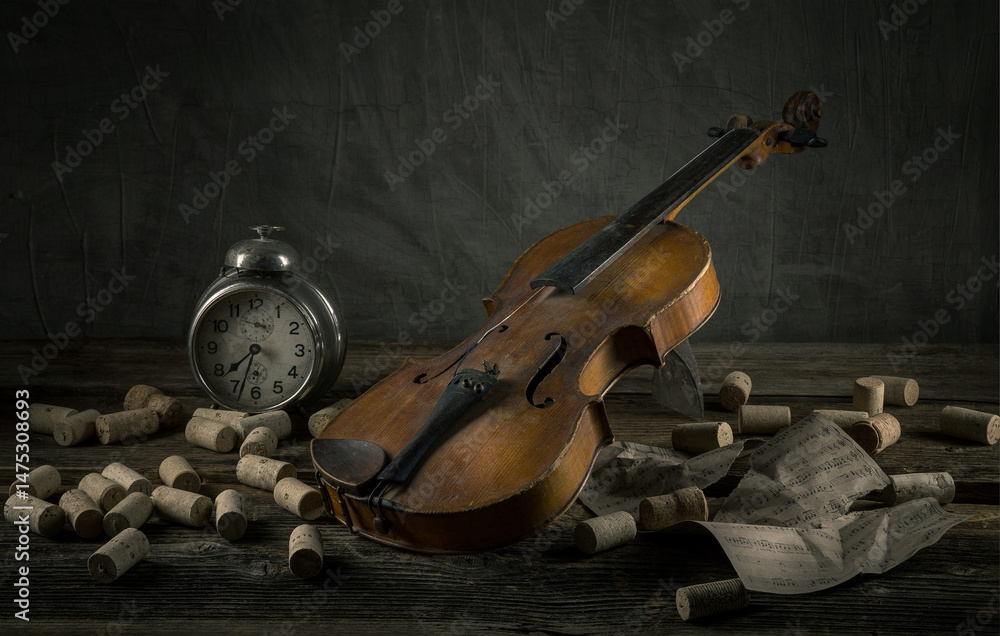 Violin resting on a wooden table with corks and an antique clock in a dimly lit room