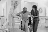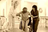 Assisting African American senior woman, caregivers helping transition from wheelchair at home