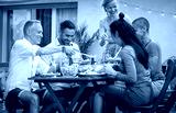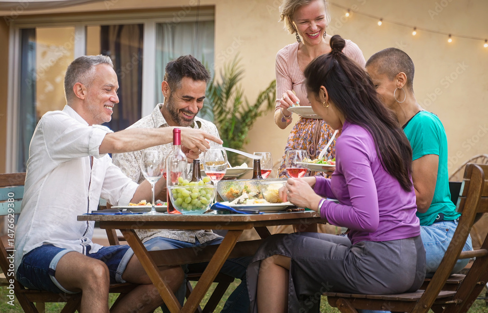 Group of mature friends enjoying a meal together outdoors, sharing food, and drinks, having fun at home