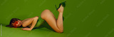 Banner. Woman lying down on green floor wearing green swimsuit and bright red visor glasses with fluffy green heels raised in air. Concept of summer time, vacation, holidays, beauty, fashion, style.