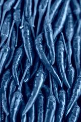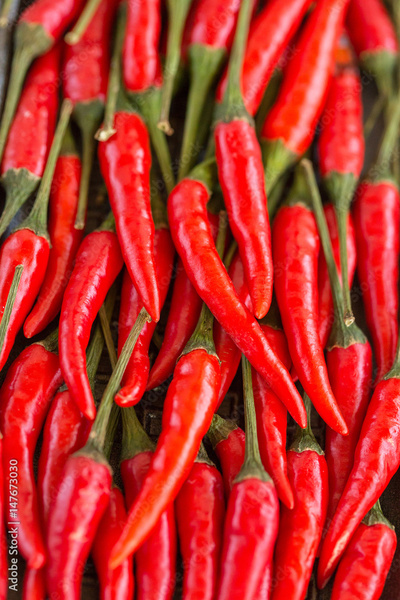 red hot chili peppers, popular spices concept - close-up on a bunch of tightly packed red chili peppers, nice clean juicy pods with green tails, top view, flat lay, vertical